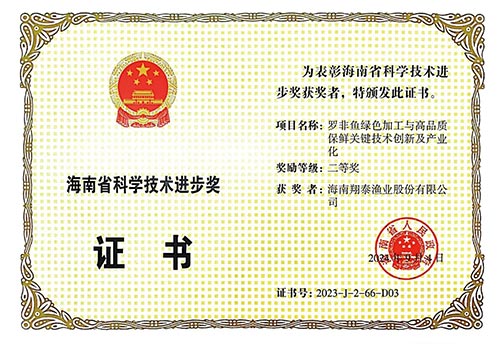 2024年9月24日,海南省科學技術廳成功舉辦了海南省科技大會暨科學技術獎勵大會,海南翔泰漁業股份有限公司與海南大學、賀州學院等單位共同完成的《羅非魚綠色加工與高品質保鮮關鍵技術創新及產業化》項目,榮獲2023年度海南省科技進步獎二等獎。