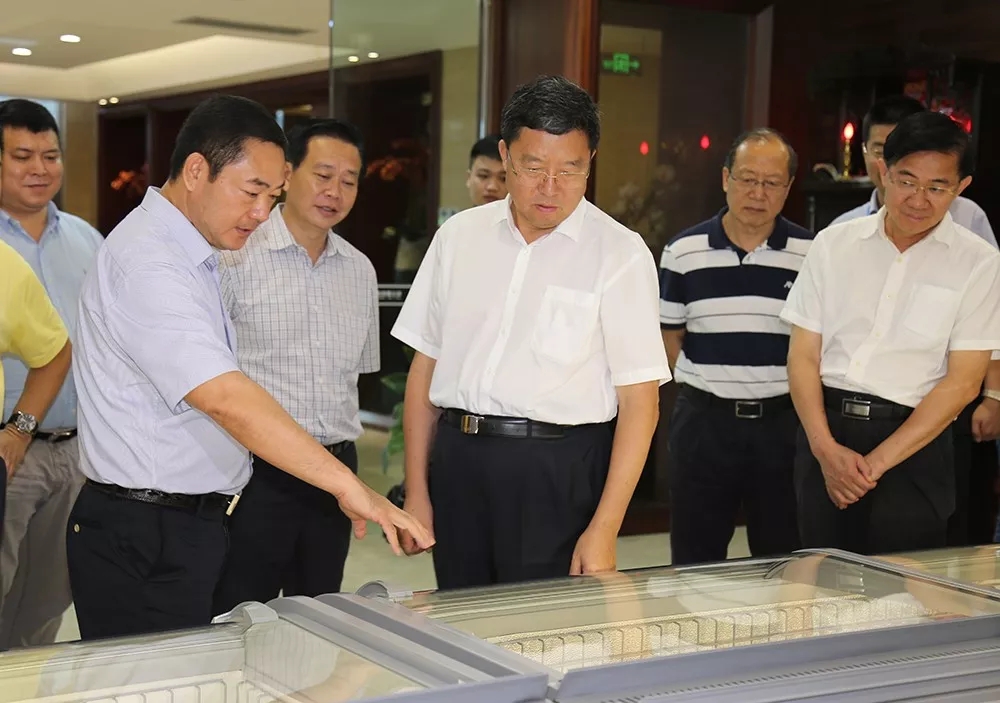 省政協主席毛萬春一行首先參觀翔泰產品展示廳,翔泰漁業董事長劉榮杰介紹了翔泰各大系列產品,包括金鯧魚、羅非魚、南美白蝦以及其它深加工產品。省政協主席毛萬春對翔泰產品的多樣性,表示出了高度贊賞。