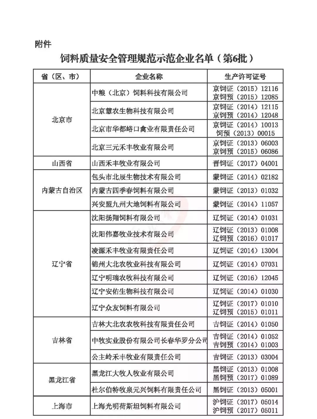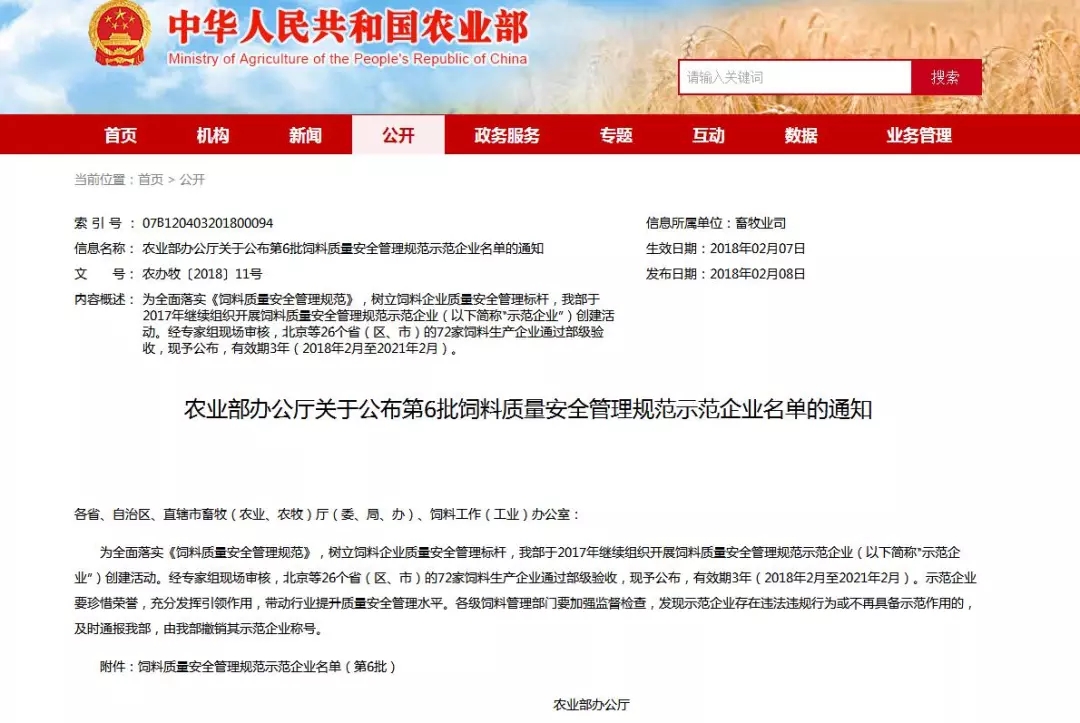 為全面落實《飼料質(zhì)量安全管理規(guī)范》,樹立飼料企業(yè)質(zhì)量安全管理標(biāo)桿,我部于2017年繼續(xù)組織開展飼料質(zhì)量安全管理規(guī)范示范企業(yè)(以下簡稱“示范企業(yè)”)創(chuàng)建活動。經(jīng)專家組現(xiàn)場審核,北京等26個省(區(qū)、市)的72家飼料生產(chǎn)企業(yè)通過部級驗收,現(xiàn)予公布,有效期3年(2018年2月至2021年2月)。示范企業(yè)要珍惜榮譽(yù),充分發(fā)揮引領(lǐng)作用,帶動行業(yè)提升質(zhì)量安全管理水平。各級飼料管理部門要加強(qiáng)監(jiān)督檢查,發(fā)現(xiàn)示范企業(yè)存在違法違規(guī)行為或不再具備示范作用的,及時通報我部,由我部撤銷其示范企業(yè)稱號。