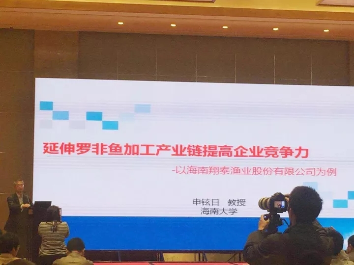在會議上,海南大學申鉉日教授以翔泰漁業羅非魚加工產業鏈為例,分析了翔泰漁業的羅非魚加工優勢;此外,翔泰漁業董事長劉榮杰親臨現場,參與本次大會的中國羅非魚產業發展趨勢討論,對羅非魚未來發展趨勢作出了獨到的見解以及指出了翔泰在羅非魚行業未來的發展方向。