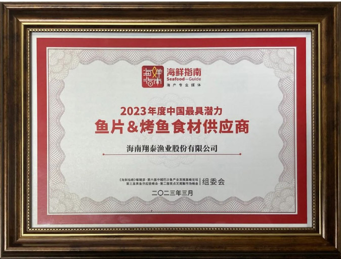 (圖為:海南翔泰漁業榮獲“2023年度中國最具潛力魚片&烤魚食材供應商”)