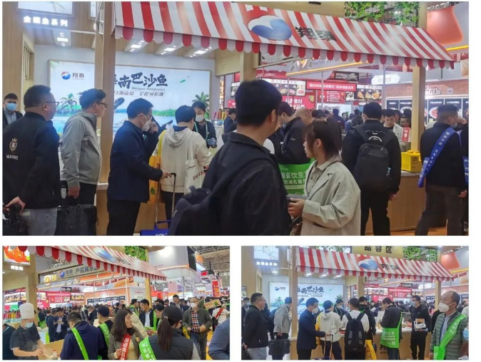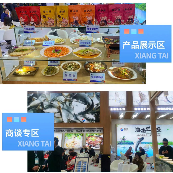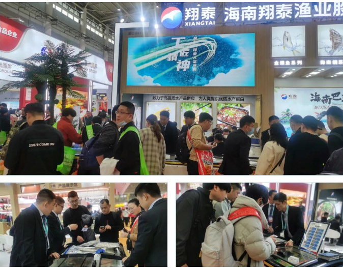 展柜上展示翔泰"三魚兩蝦"產品生鮮食材及多樣化的預制菜產品系列,展位一度爆滿,咨詢、參觀、品嘗、洽談、簽約,在場的客商絡繹不絕,成為展會現場最靚麗的一道風景。