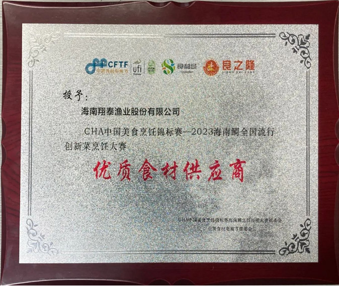 (圖為:海南翔泰漁業榮獲“優質食材供應商”證書)
