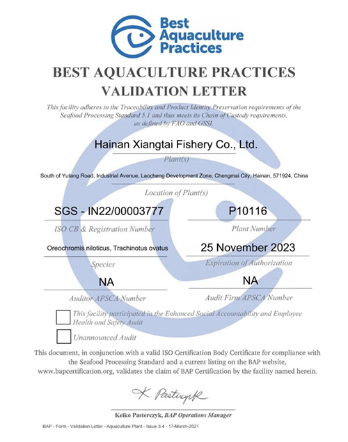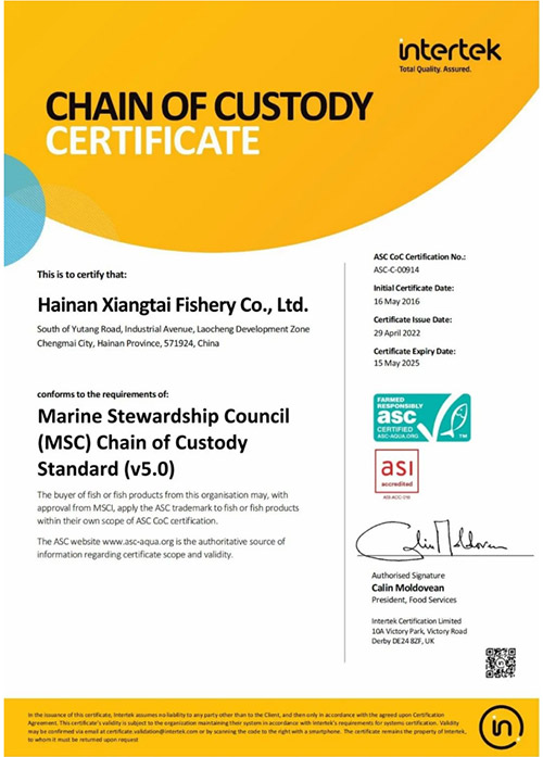 翔泰羅非魚于2015年通過海南省首家ASC認證,公司始終以發展環境友好型的水產養殖為企業發展目標,致力于高品質水產品供應,為人類提供最優質海鮮水產品的理念,與ASC關注全球水產養殖可持續健康發展的宗旨高度一致。