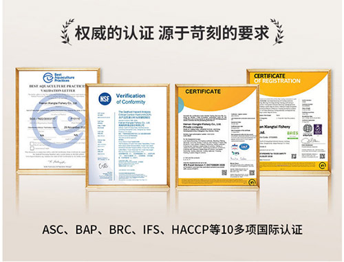 依托于全產業鏈優勢,我們建立了完善的追溯體系,實現產品從源頭到餐桌的全程可追溯。公司產品先后通過了無公害產品產地認證,以及BAP、ASC、BRC、IFS、HACCP等1O多項國際認證。此外,翔泰羅非魚還獲得了海南鯛認證以及“海南羅非魚”農產品地理標識授權書。在未來,我們將繼續不斷提高產品研發創新能力,做國民信任的水產品品牌,成為水產行業的領先者。