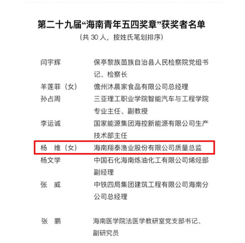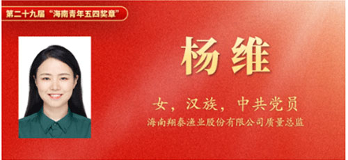 為深入貫徹落實黨的二十大精神,集中展示新時代海南青年良好的精神品格和激昂的奮斗精神,樹立一批在海南自由貿易港建設中做出突出業績和重大貢獻的先進青年典型,激勵全省廣大青年擔當作為,為海南自由貿易港建設貢獻青春和力量。5月4日,第二十九屆“海南青年五四獎章”評選結果揭曉,30名青年7個集體獲殊榮。其中,來自海南翔泰漁業股份有限公司的楊維青年獲評,被授予第二十九屆“海南青年五四獎章”。
