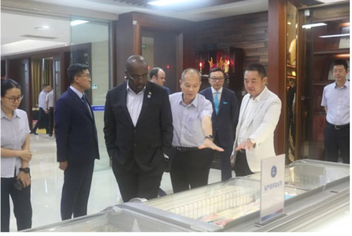 期間,海南翔泰漁業董事長劉榮杰陪同安提瓜和巴布達政府官員們先后參觀了沙盤模型,產品展示廳,觀看了公司宣傳片,并對我司的全產業鏈核心競爭力、生產規模、市場現狀等方面進行了介紹分享。