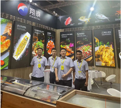 翔泰在展會現場展示了金鯧魚,海南鯛,巴沙魚,黑虎蝦、海南對蝦以及風味烤魚、酸菜魚、調味魚排、免漿魚片等數十種美味、便捷、省時的預制菜式產品。
