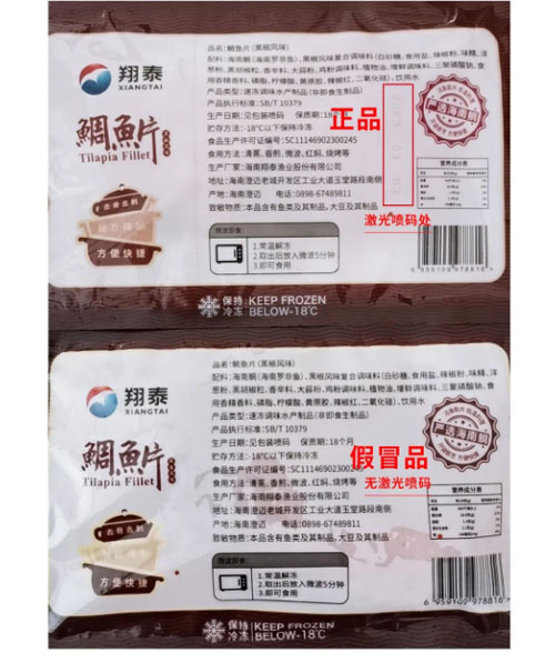 翔泰調味魚排自上市以來,深受廣大消費者的喜愛。近日,市場上出現大量假冒仿制品,品質低劣、口感粗糙,嚴重影響消費者體驗及我司的品牌形象,我司將聯合工商部門嚴厲打擊假冒仿制品。下圖是正品和假冒仿制品的區別: