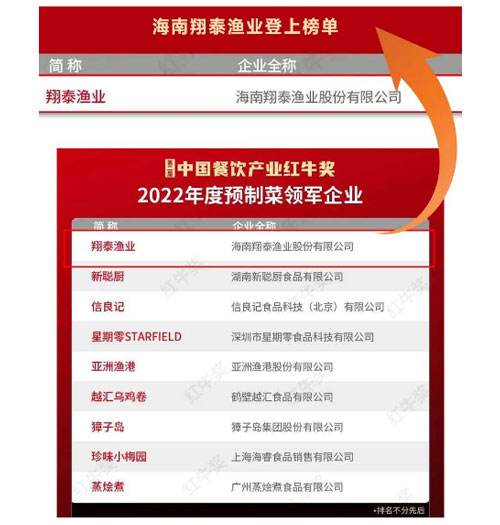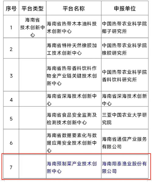 近日,海南省科學技術廳公布了2022年度海南省技術創新和科技成果轉化平臺名單,海南翔泰漁業股份有限公司(以下簡稱“翔泰”)預制菜產業技術創新中心成功入選。