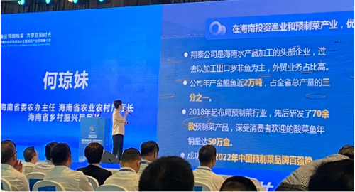 隨后,海南省農(nóng)業(yè)農(nóng)村廳廳長何瓊妹介紹,隨著自貿(mào)港建設(shè)加速推進(jìn),海南搶抓預(yù)制菜產(chǎn)業(yè)風(fēng)口,先后引進(jìn)了4家預(yù)制菜項目并已建成投產(chǎn),研發(fā)出了即食、即熱、即烹、即配四大類近1000種產(chǎn)品。同時介紹了翔泰作為海南水產(chǎn)品加工的頭部企業(yè)近年來在預(yù)制菜方面所取得的成就。