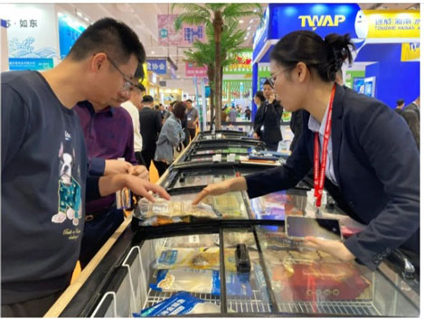 此次展會(huì),海南翔泰漁業(yè)除了展出:深海金鯧魚、海南黑虎蝦、松鼠魚、泡椒魚皮、海南鯛、巴沙魚、海南對(duì)蝦以及風(fēng)味烤魚、酸菜魚、調(diào)味魚排、免漿魚片等數(shù)十種美味、便捷、省時(shí)的預(yù)制菜式產(chǎn)品外,還展出了大西洋真鱈魚頭和加州筆管魷魚兩款新品,其中大西洋真鱈魚頭引起客戶們濃厚的興趣,現(xiàn)場(chǎng)試吃過(guò)真鱈魚頭的客戶紛紛贊不絕口,并有客戶當(dāng)場(chǎng)簽下了訂單。